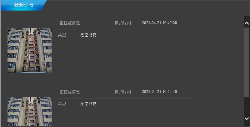 检测详情可看到详细抓拍时间,识别“高空抛物”轨迹,实现实时追溯↓↓