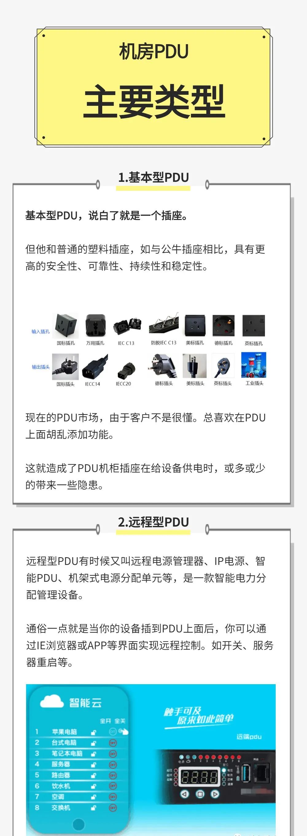 综上所述,作为机柜专用电源插座的PDU不但有基本型和远程型之分,而且相对于普通插座具有安全质量好、承载功率大、插座制式种类多、保护功能齐全、控制功能灵活、使用方便等多方面的优点。